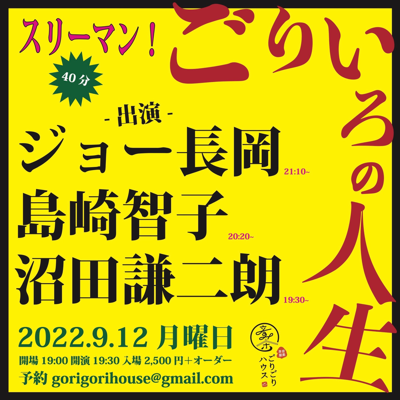 2022年09月12日(月) 終了 埼玉越谷音楽茶屋ごりごりハウス ジョー長岡 島崎智子 沼田謙二朗 OPEN19:00 START19:30 DOOR2,500YEN+ORDER 予約 gorigorihouse@gmail.com ''ごりいろの人生''