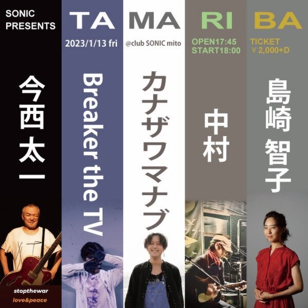 2023年01月13日(金) 終了 水戸ソニックSONIC PRESENTS TAMARIBA 今西太一 島崎智子 カナザワマナブ Breaker the TV 中村 ●開場/開演 17:45/18:00 ●チケット料金 【前売】¥2,000+D 【当日】¥2,500+D ●チケット予約 https://tiget.net/events/219027