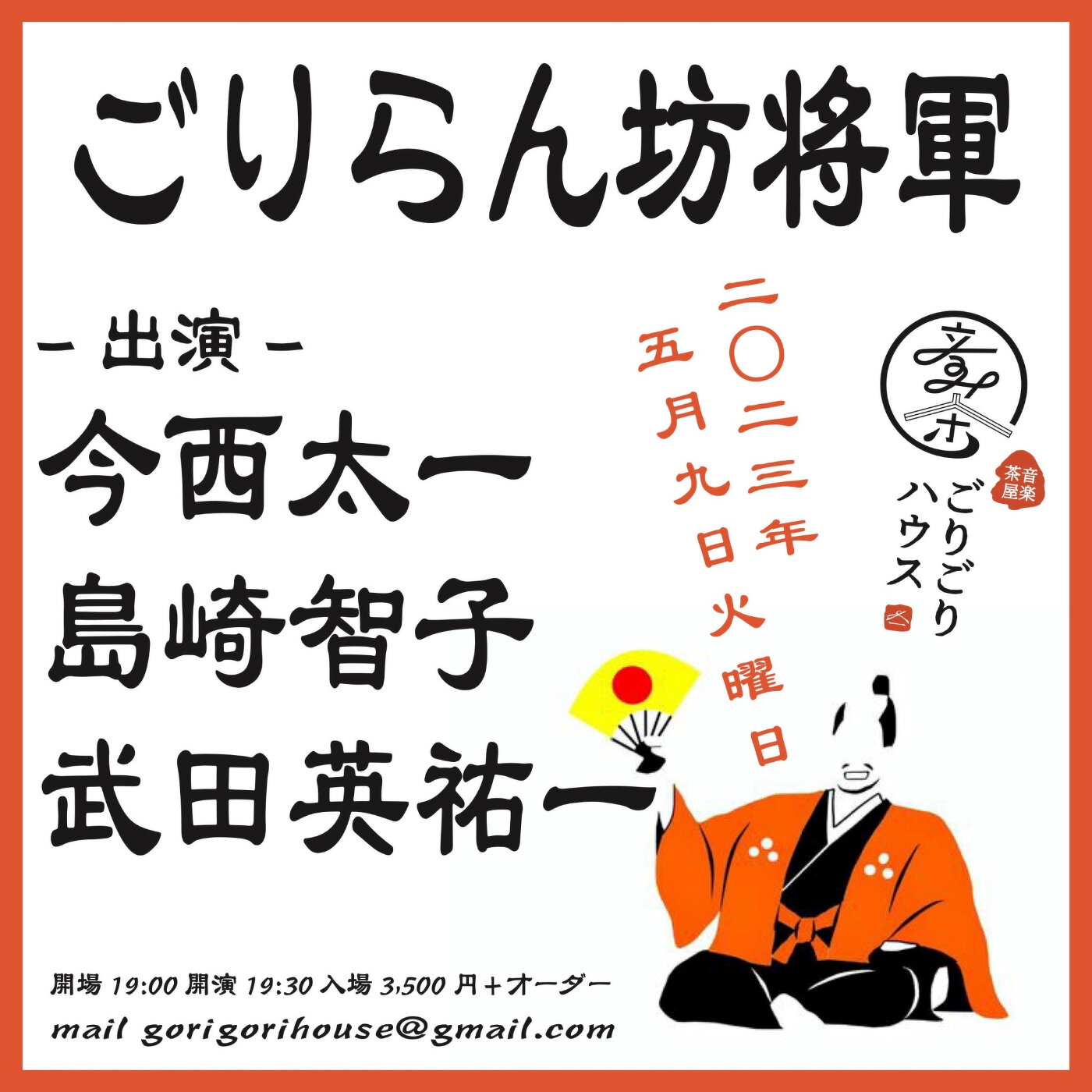 2023年05月09日(火) 終了 埼玉越谷音楽茶屋ごりごりハウス [ごりらん将軍] 出演 今西太一 島崎智子 武田英祐一 OPEN 19:00 START 19:30 入場 3,500YEN+オーダー 予約 gorigorihouse@gmail.com