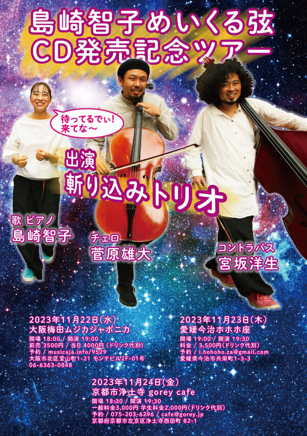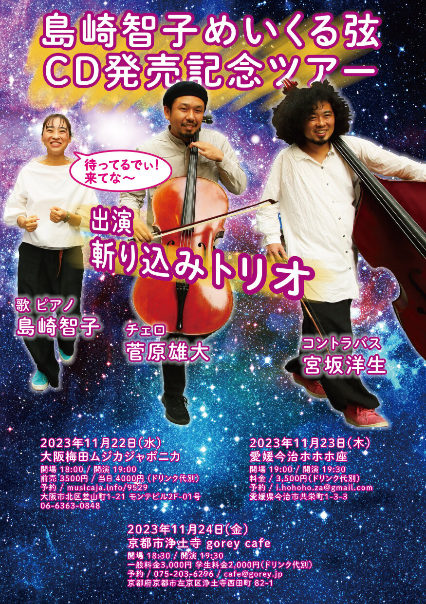 2023年11月24日(金) 終了 京都市浄土寺 gorey cafe「島崎智子めいくる弦CD発売記念ツアー京都編」 出演:島崎智子めいくる弦トリオ 歌ピアノ島崎智子 チェロ菅原雄大 コントラバス宮坂洋生 開場 18:30/開演 19:30 一般料金3,000円 学生料金2,000円(いずれも+1オーダー) ご予約↓gorey cafe 075-203-6296 / cafe@gorey.jp 京都府京都市左京区浄土寺西田町 82-1 www.gorey.jp