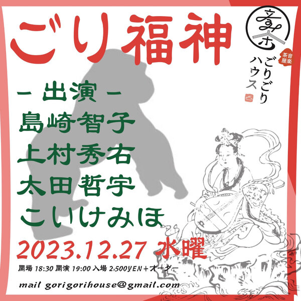 2023年12月27日(水) 終了 埼玉越谷 音楽茶屋ごりごりハウス [ごり福神] 開場18:30 開演19:00 入場2,500YEN+オーダー -出演- 島崎智子 上村秀右 こいけみほ 太田哲宇 予約↩️ gorigorihouse@gmail.com 埼玉県越谷市越ケ谷1-12-19柴田ビルⅡ1F HP↩️ https://ongakujaya-gorigorihouse.com/