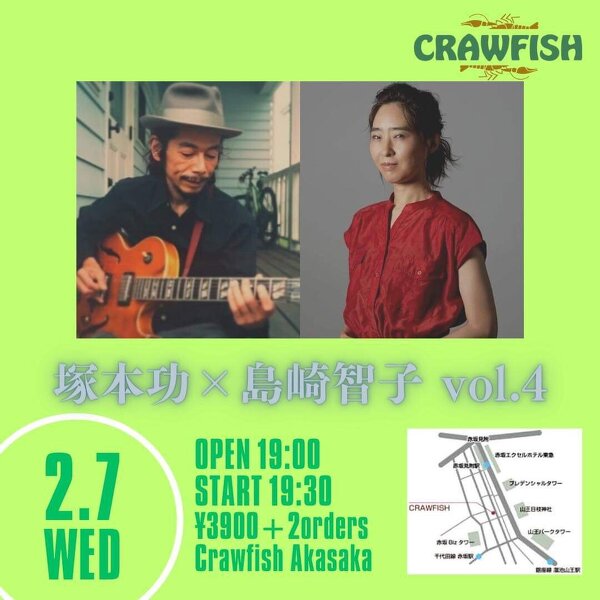 2024年02月07日(水) 終了 東京赤坂クローフィッシュ 塚本功 × 島崎智子 開場19:00 開演19:30 料金¥3900 +2オーダー ご予約は、 8.tomoko.shimasaki.8@gmail.com に、 開催日、お名前、お電話番号、人数 を送信してくだチャイ^o^ TEL.03-3584-2496 東京都港区赤坂3-11-7ソシアル赤坂地下