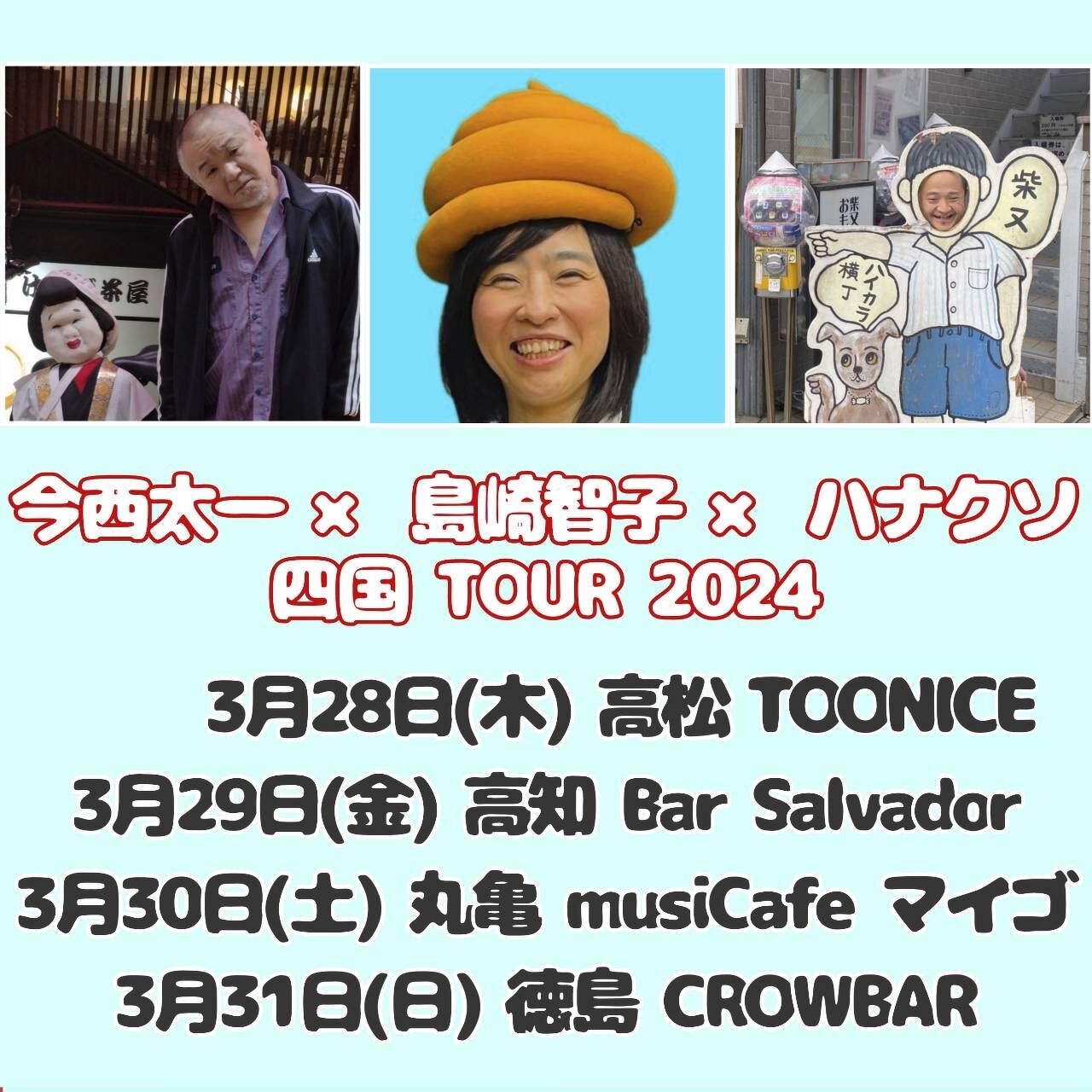 2024年03月28日(木) 終了 香川高松 TOONICE 今西太一×島崎智子×ハナクソ四国ツアー2024 今西太一/ハナクソ/島崎智子/西川ユウヒスキー /椿ミイ /みやも and more !!! OPEN / START 19:00 / 19:30 ADV / DOOR 1500yen / 2000yen (+1DRINK ORDER) 香川県高松市亀井町8-8 FL菊池寛通りビル地下 087-802-1069