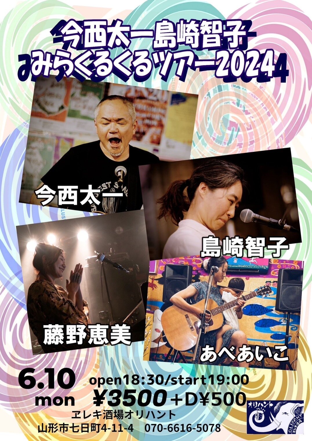 2024年06月10日(月) 終了 山形県山形 ヱレキ酒場オリハント「今西太一島崎智子みらくるくるツアー2024」 OPEN 18:30/START 19:00 料金 ¥3500+1dオーダー 出演 今西太一、島崎智子、藤野恵美、あべあいこ