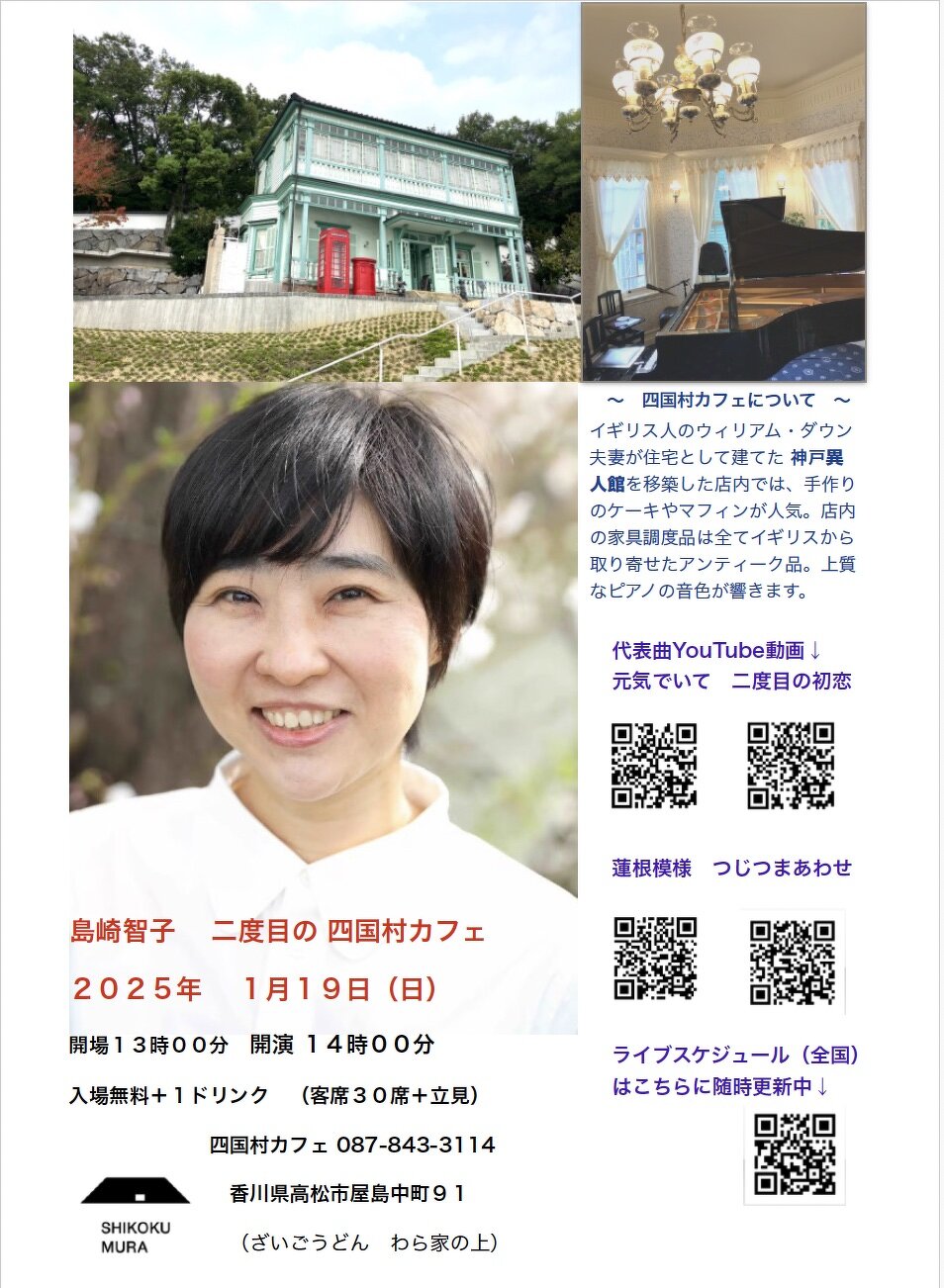 2025年01月19日(日) 終了 香川高松 島崎智子コンサートin四国村カフェ 開場13:00 開演14:00 入場無料+1ドリンク 問合 087-843-3114 香川県高松市屋島中町91 (ざいごうどん わら家の上)