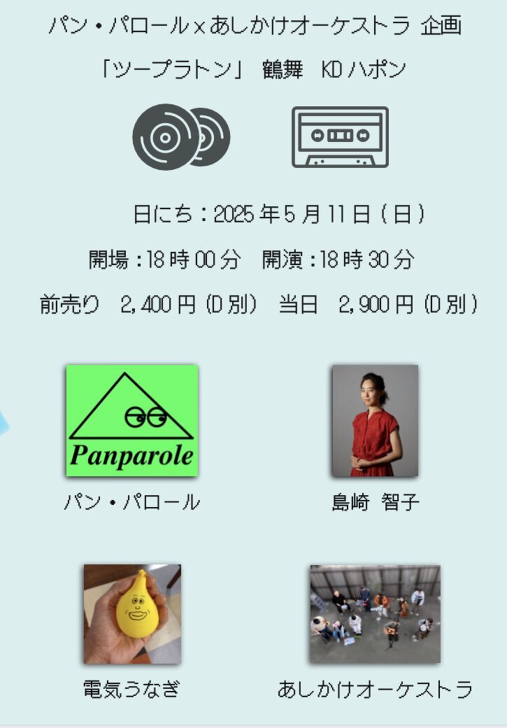 2025年05月11日(日) 終了 名古屋鶴舞KDハポン / パン・パロール×あしかけオーケストラ企画 「ツープラトン」 open 18:00 start 18:30 予約 ¥2,400(D別) 当日 ¥2,900(D別) 出演 パン・パロール 島崎智子 電気うなぎ あしかけオーケストラ 予約↓ https://kdjapon.jimdofree.com/%E3%82%A4%E3%83%99%E3%83%B3%E3%83%88%E4%BA%88%E7%B4%84/ 問合↓ 名古屋市中区千代田5丁目12-7 TEL 070-5257-1324 (052)251-0324 kdjapon@gmail.com