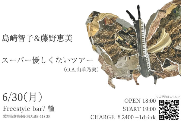 2025年06月30日(月) 終了 愛知豊橋 Freestyle bar? 輪-RiN- / 島崎智子藤野恵美スーパーやさしくないツアー 出演 オープニングアクト : 山羊乃実 藤野恵美 島崎智子 OPEN 18:00 START 19:00 CHARGE ¥2,400+1drink 予約/問合 https://docs.google.com/forms/d/e/1FAIpQLSdndlYMPT-w-32z37IJBVYJ0GxUYRbQbVg-1zbZNl4W_p58Wg/viewform 愛知県豊橋市駅前大通3-118 2F