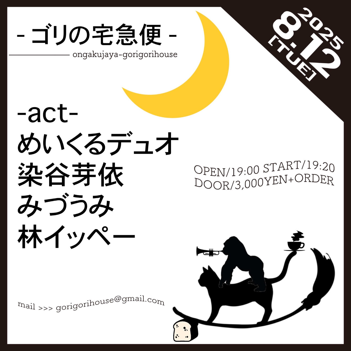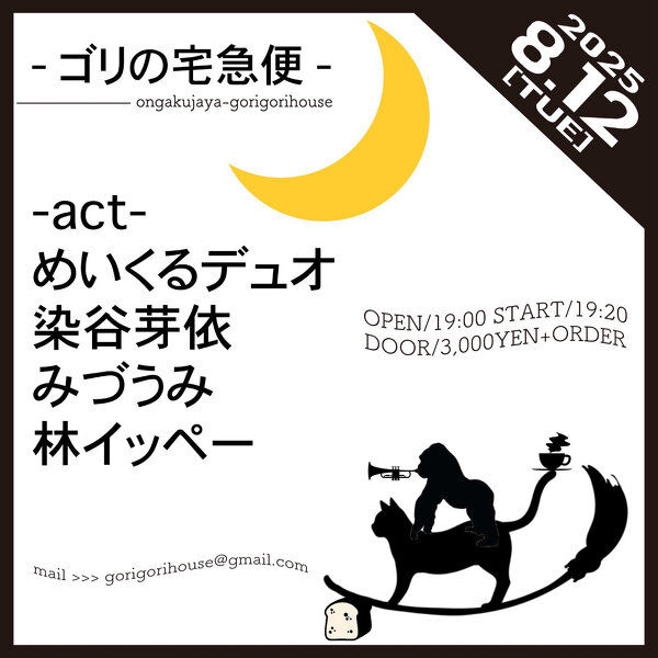 2025年08月12日(火) 終了 埼玉越谷 音楽茶屋ごりごりハウス [ゴリの宅急便] 開場19:00 開演19:20 入場3.000YEN+オーダー -出演- めいくるデュオ(歌ピアノ島崎智子 チェロ菅原雄大) 染谷芽依 みづうみ 林イッペー 予約 gorigorihouse@gmail.com HP ongakujaya-gorigorihouse.com