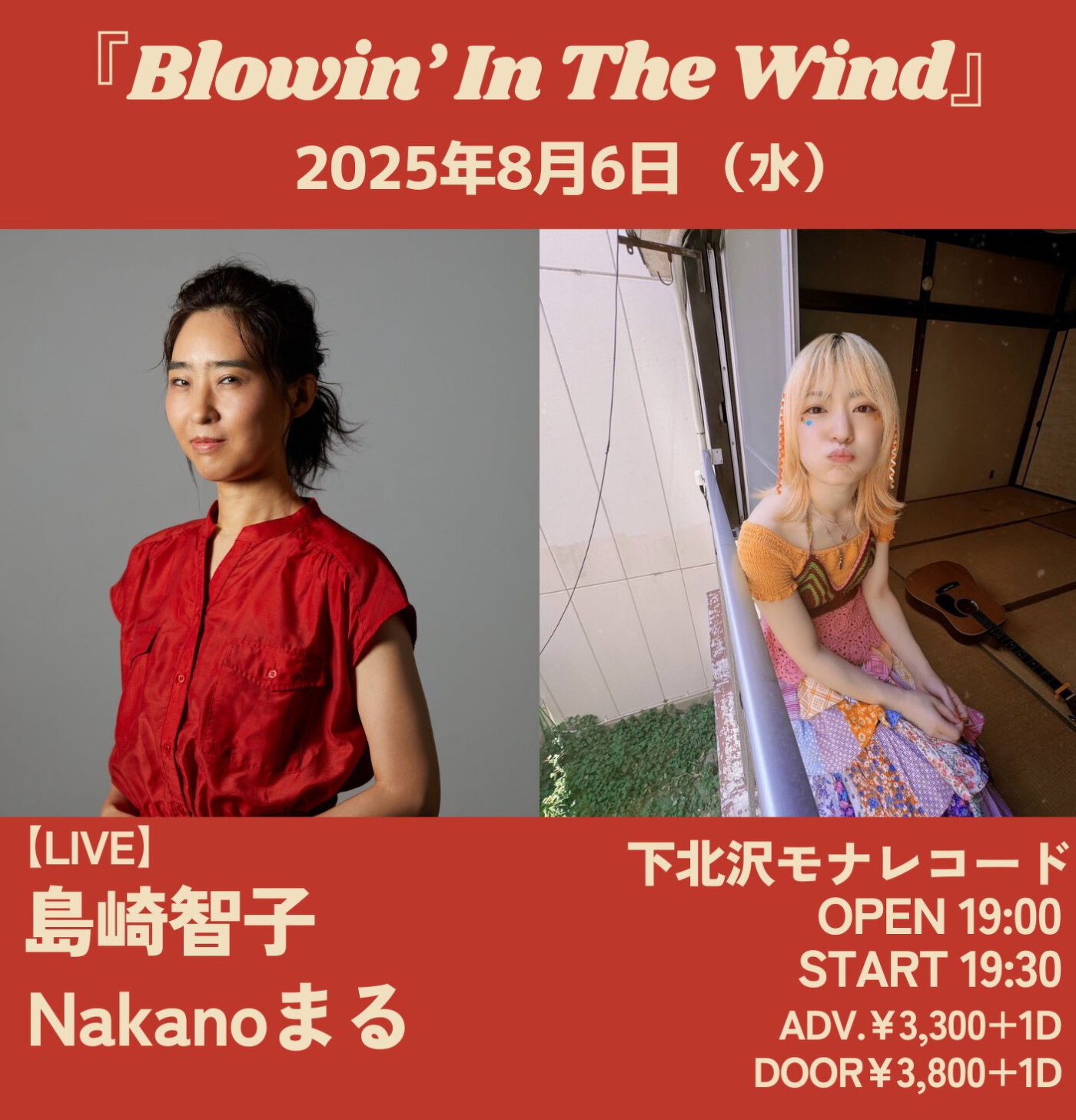 2025年08月06日(水) 終了 東京下北沢 mona records 『Blowin’In The Wind』 charge :ADV.¥3300+1D/DOOR.¥3800+1D Open19:00/Start19:30 出演 島崎智子 Nakanoまる 予約↓ tiget.net/events/412455