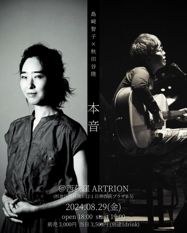 2025年08月29日(金) 終了 【配信あり】東京西荻窪ARTRINON "本音" 出演 島崎 智子 秋田谷 陸 open 18:00 start 19:00 前売3000円 当日3500円 +1ドリンクオーダー 配信2000円 視聴URL https://premier.twitcasting.tv/artrion_n/shopcart/392088 予約/問合↓ artrion.n@gmail.com 杉並区西荻南3-12-1 日伸西荻プラザ B-5