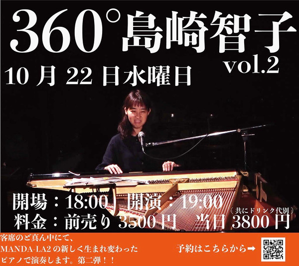 2025年10月22日(水) 終了 東京吉祥寺MANDA-LA2「360° 島崎智子」 客席の真ん中にグランドピアノを置いてやる企画 vol.2 前売3500円/当日3800円 +1ドリンクオーダー 開場18:00/開演 19:00 出演 島崎智子 予約 https://tiget.net/events/428526 問合 manda-la2.com/contact ※360°企画、三日間通し券7,500円あり。 21日齊藤さっこ×かくれみの 22日島崎智子 23日水ゐ涼 0422-42-1579 〒180-0003 東京都武蔵野市吉祥寺南町2-8-6 第18通南ビル地下1階