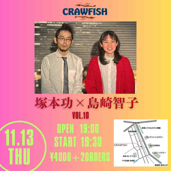 2025年11月13日(木) 終了 東京赤坂クローフィッシュ 塚本功×島崎智子vol.10 出演 塚本功 島崎智子 19:00オープン 19:30スタート 3,900円+2オーダー ご予約↓ crawfish.jp/yoyaku 03-3584-2496 東京都港区赤坂3-11-7ソシアル赤坂地下 師弟ユニットみたいになって参りましたが弟子だとは認められておらず非公式。 塚本功さんは音楽を体現していて物凄く尊敬しています。 私が大好きなピアノ、ベヒシュタインもありリッチ仕様なお店。 皆さんにも体験してもらいたい。 もっと音楽で会話出来るようになりたい!