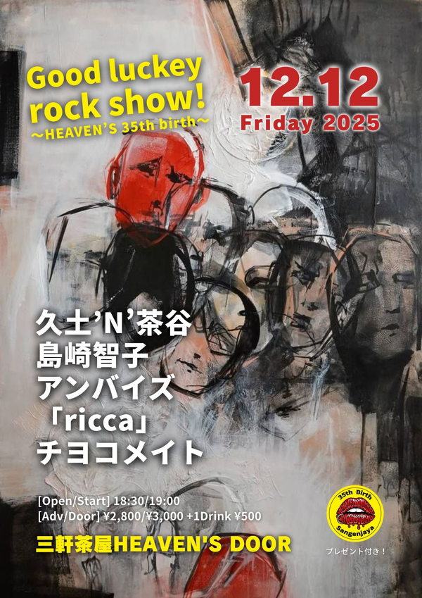 2025年12月12日(金) 終了 東京三軒茶屋 HEAVEN’S DOOR / 35TH BIRTH open18:30 start19:00 前売2800円 当日3000 円 +ドリンク代500 円 周年プレゼントがあるみたいです! 予約 https://heavens-door-music.com/ticket-yoyaku/ 出演 久土`N' 茶谷 「ricca」 アンバイズ 島崎智子 チョコメイト 東京都世田谷区三軒茶屋1-33-19 B1F 電話:03-3410-9581 (17:30〜営業時間内)