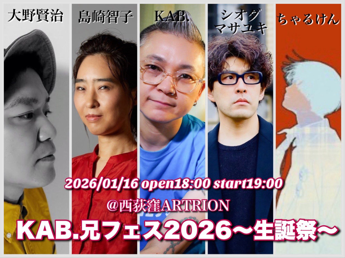 2026年01月16日(金) 終了 東京 西荻窪 ARTRION / KAB.兄フェス2026〜生誕祭〜 開場18時 開演19時 出演 大野賢治 シオダマサユキ 島崎智子 ちゃるけん 料金:前売3000円 当日3500円(1D別途) 予約/問合↓ artrion.n@gmail.com 配信:2000円(アーカイブ14日間)↓ https://premier.twitcasting.tv/artrion_n/shopcart/414977 杉並区西荻南3-12-1 日伸西荻プラザ B-5